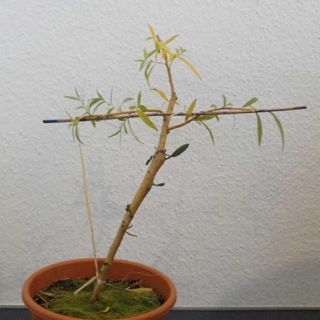 Das horizontale Stöckchen dient dazu, die Zweige runterzubiegen. Sie würden nämlich sonst ziemlich steil nach oben deuten. Die dunklen Blätter am Stamm sind die Misteln. Der Stamm selbst in deutlich dicker geworden, was ja auch in Richtung Bonsai geht. Schräg war der Stamm ohnehin schon, ich muß wohl unachtsam gewesen sein, als ich den Steckling eingepflanzt habe (Mitte).
